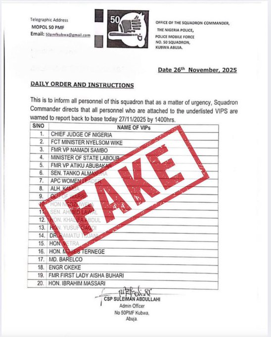 The purported document, allegedly originating from the 50 Police Mobile Force (PMF) Squadron in Abuja and signed by one “CSP Suleiman Abdullahi,” was categorically dismissed as fake.